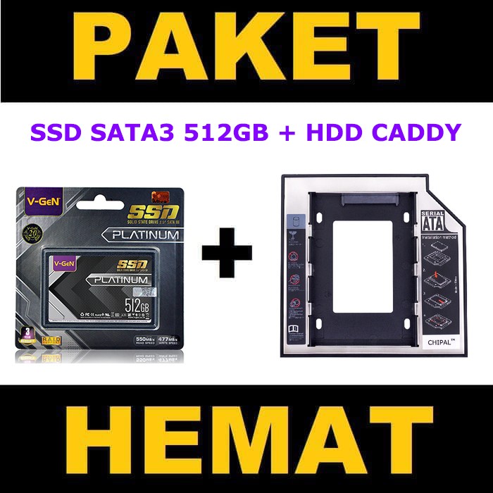 SSD V-GeN Platinum 512GB SATA3 dengan HDD Caddy DVD, kecepatan tinggi, ringan, dan bergaransi 3 tahun.